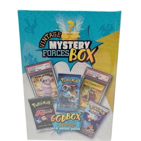 Frsteutgave vintage-kort er spredt ut i boksene. Grunnsett-kort er ogs spredt ut over hele samlingen. Finn God Box eller se etter en sjanse til trekke vintage boosterpakker. Inkludert i denne samlingen er Base set 2, Ex Dragon Frontiers, Gym Challenge, Gym Heroes og Base set boosters.