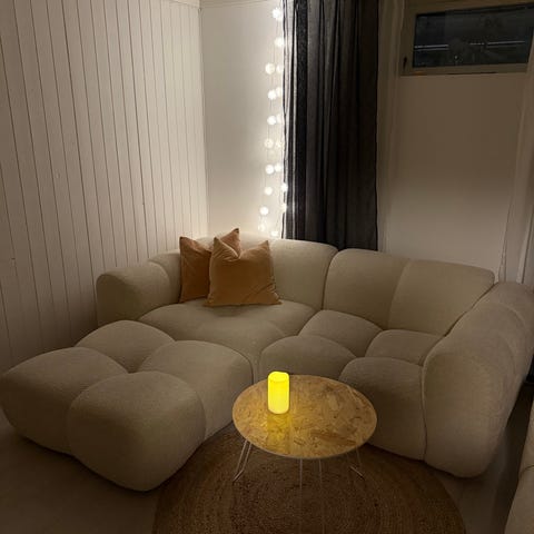 Produktbeskrivelse Trendy og svært komfortabel 2-seter sofa i naturfarget, slitesterkt tekstil med fransk kantsøm, perfekt for moderne hjem. Modulsofaens robuste utforming med skjulte ben tilfører både stil og komfort, mens de stramme sømmene gir et elegant preg. Sofaen er solid bygget på en ramme av heltre furu og kryssfiner, noe som sikrer en holdbar kvalitet og lang levetid. Materialer og spesifikasjoner Trekk: Slitesterkt tekstil (70% polyester og 30% akryl) med fransk søm Ramme: Heltre furu og kryssfiner Farge: Natur Dimensjoner: 110 cm (L) x 93 cm (B) x 73 cm (H) Setedybde: 57 cm Sittehøyde: 44 cm Vekt: 31 kg Produktmerking: Oekotex standard 100, Forest Stewardship Council (FSC) Tilstand Sofaen er i utmerket tilstand uten tegn til slitasje eller skader. Den holder godt på fasongen og er enkel å rengjøre med en tepperenser. En utmerket løsning for elegante, moderne interiører.