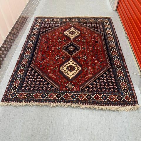 Hndknyttet teppe i ull, dekorert med tre geometriske medaljonger, p en rd, bl bakgrunn, og omgitt av tre blomsterbordurer.