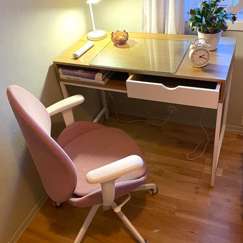 Produktbeskrivelse Den ergonomiske RH Logic Mereo kontorstolen er designet med fokus på støtte og komfort, ideell for lange arbeidsdager. Den svarte, myke stoffoverflaten gir et moderne uttrykk og en behagelig sitteopplevelse, mens det stilrene designet passer perfekt inn på kontoret. Ergonomiske funksjoner Ryggstøtte: Høy rygg med ergonomisk utforming for optimal støtte til korsryggen. Sete: Polstret sete for komfortabel sitting ved lange arbeidsøkter. Armlener: Uten armlener for maksimal bevegelsesfrihet og fleksibilitet. Justeringsmuligheter: Høydejusterbart sete for tilpasset sitting. Spesifikasjoner Merke/Modell: RH Logic Mereo Materiale: Stoff i svart på sete og rygg, plastramme Farge: Svart stoff med sort ramme Mål: Høyde: 120 cm Bredde: 45 cm Dybde: 43 cm Sittehøyde: 43 cm - 56 cm Tilstand Stolen er i godt brukt stand, med noen mindre bruksmerker. Helhetsinntrykket er fortsatt pent, og alle justeringsmekanismer fungerer som de skal.