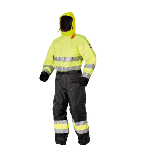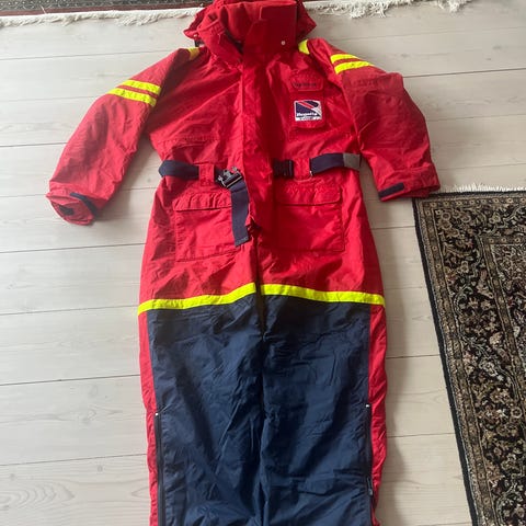 Flytedrakten har vindtett og vannavvisende ytterstoff, gummierte mansjetter med borrelås innstramming og innvendig snor for stramming i livet.