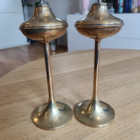 De presenterer seg med en lang rund base p 13 cm, herfra en sylinder p 7 cm hy som er sveiset til den midtre delen av lyset. En er 42 cm hy, den andre 40 cm med klokken, uten 28 cm og 26 cm.