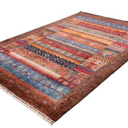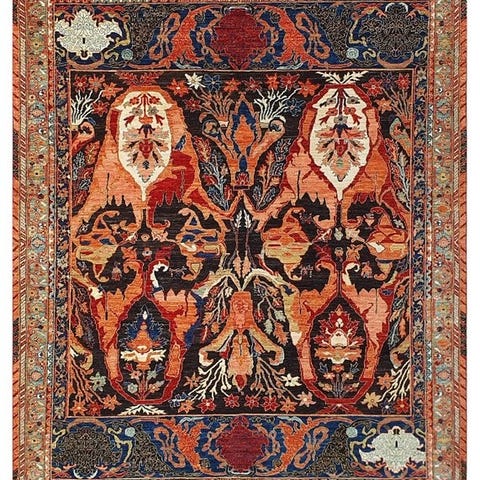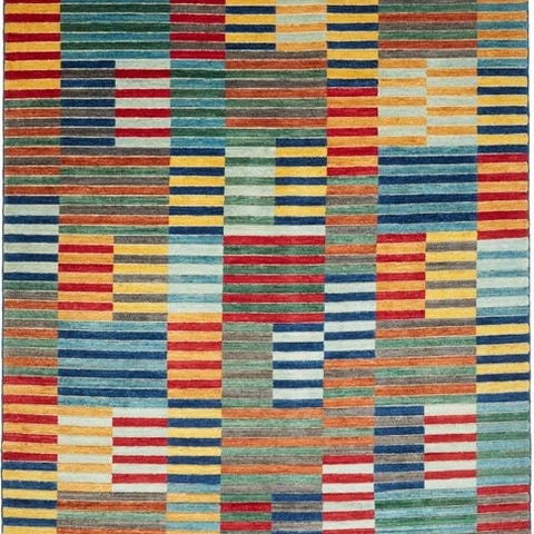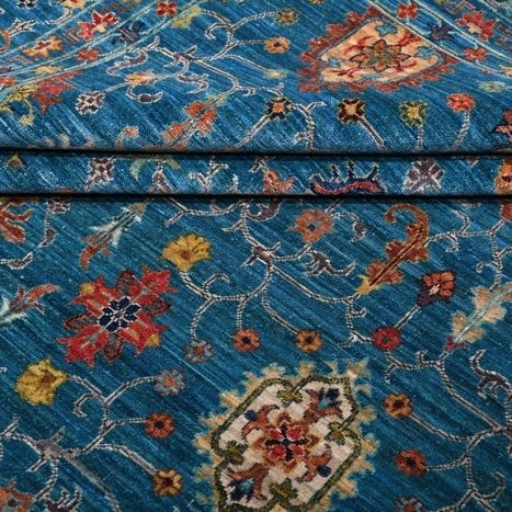 Akzentene i bltt, gull, rosa og krem bringer livlige detaljer inn i helhetsbildet, uten virke ptrengende. Laget av hykvalitets hndtvunnet ull, kombinerer dette teppet mykhet, slitestyrke og hyeste knutekunst.