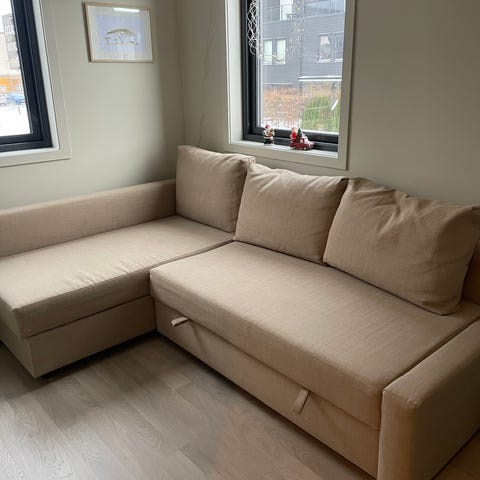 Vi sleger en sovesofa fra utastillingen. Den har oppbevaring under, og er lett å slå ut. Liggemål 140x200cm-Farge varm beige.