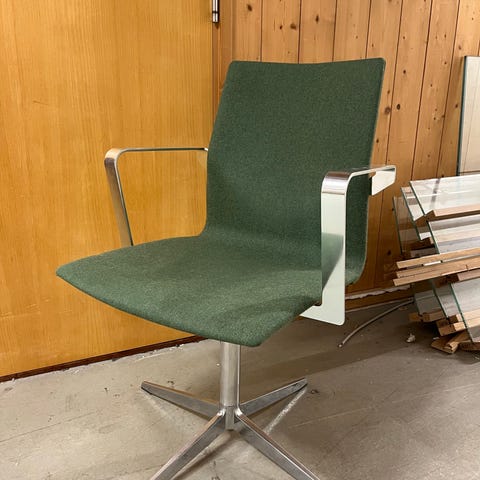 Produktbeskrivelse Stablingsbare konferansestoler fra AJ Produkter med polstret sete og rygg i slitesterkt kunstskinn. Stolenes moderne design og kombinasjon av svart kunstskinn og krom understell gir et stilrent uttrykk, perfekt for møter, konferanser og konserter. Ergonomiske funksjoner Ryggstøtte: Polstret rygg for ekstra komfort ved langvarig sitting Sete: Setet er komfortabelt og tilpasset for lange møter Stabilitet: Robust kromramme gir stabilitet og holdbarhet Justeringsmuligheter: Ingen justeringsmuligheter, men designet for optimal sittestilling Spesifikasjoner Merke/Modell: AJ Produkter NELSON Materiale: Kunstskinn (sete og rygg), stål (understell) Farge: Svart kunstskinn med krom understell Stabelbar: Ja, opp til 10 stk. Tilstand Stolene er i utmerket tilstand med noen synlige riper og merker. Leveres montert.