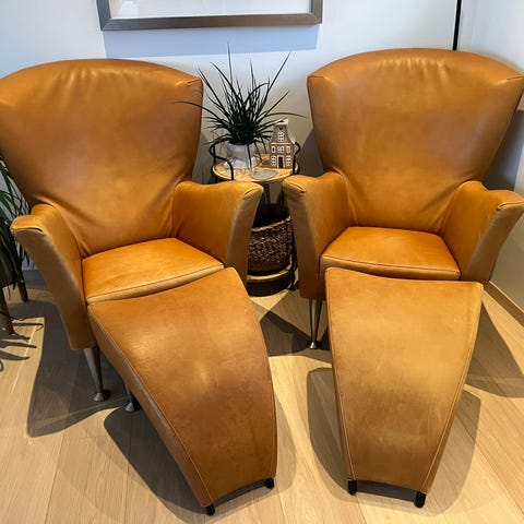 2 stk. Eksklusiv Brunstad Delta Legend lenestoler med krakk – tidløs eleganse og førsteklasses komfort.