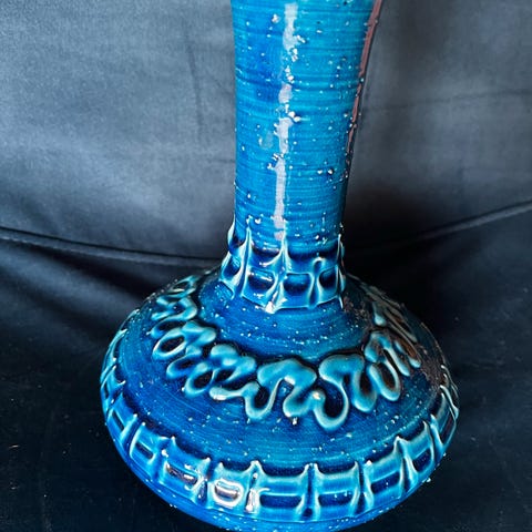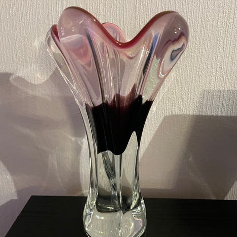 Praktfull vase med den karakteristiske dekorasjonen under glasset av Giovanni De Simone, fra 1970-tallet. Hyde p 19 cm og diameter p kroppen p 10,5 cm. Kunstnerens signatur bde p kroppen og under basen, sammen med nummerering. I tilstand nesten perfekt. Nyaktig emballasje og sporbar frakt.