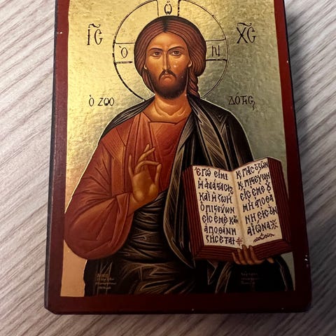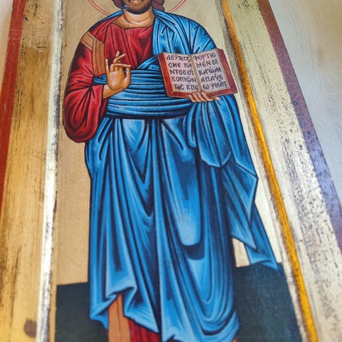 Ikon-triptyk (rigid, ikke-foldbar) av Korsfestelsen av Jesus Kristus med helgener, laget av metall (kobber) fra 1950-tallet. I svrt god stand.