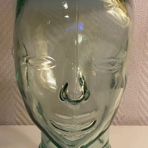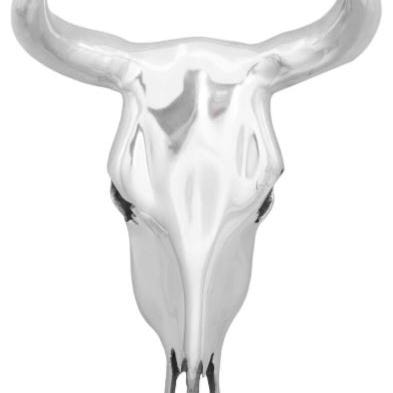 Et stort oksehode dekket av glassmosaikk. Hodeskallen er fullstendig dekorert for hnd med stor omhu. Det er et uvanlig, dekorativt stykke.