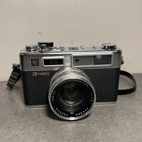 Yashica 35 YE veksler opp. Designet er basert p Nicca 33. Leveres med matchende Yashikor 5cm 2.8-objektiv, original bruksanvisning, 40,5 UV-filter og opptrekksspole.