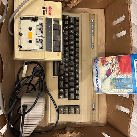 Til salgs str en original Commodore 64C Heimcomputer i den lyse C-versjonen.
