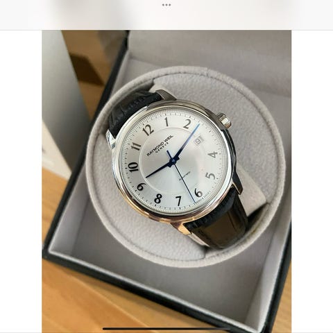 Et vakkert klassisk armbndsur fra Raymond Weil, fra Maestro-serien. Referansenummer 2837-STC-70001. Klokken drives av et automatisk urverk (Calibre RW 4200) som er synlig p baksiden av klokken. Urskiven er lett lese takket vre kontrasten mellom viserne, indeksene og den solstrlende brune bakgrunnen p urskiven.