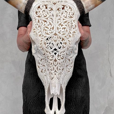 Et stort hndgravert oksekranie, gravert av hndverkere som har viderefrt den gamle kunsten gravere fra far til snn. Skallen er fullt ut skret for hnd med stor omhu. Det er et uvanlig, dekorativt stykke.