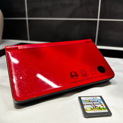 Nintendo Dsi XL 25-rsjubileum for super Mario, en sjelden konsoll finne, som dere kan se p bildene, fremstr den i perfekt stand. Selv de to eskene er godt bevart. Auksjon for ekte samlere.