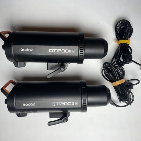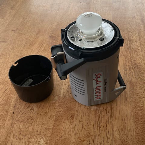 Flash til vintage studio for portretter, med parabola fra 1995, funksjonelle uten stativ, parabola og 2 strm kabler p 1,5 m og 2-2,30 m. Mller i midten av parabolen er ikke originale.