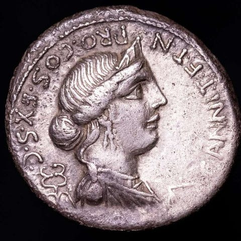 Slv quinarius (1,64 g. 14 mm). - Emerita myntverk. 25-23 f.Kr.