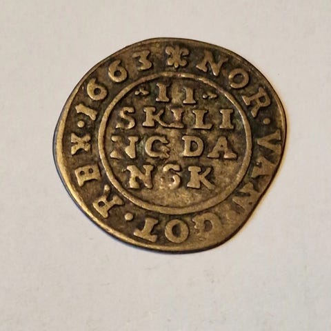 Obv: FRIDERIC9 III.D:G.DAN (Frederik III (Konge av) Danmark ved Guds nde) Oval skjold med krone (mange ulike typer med eller uten notcher) med Danmarks vpen deler datoen ved sidene. Inskripsjon rundt kanten.