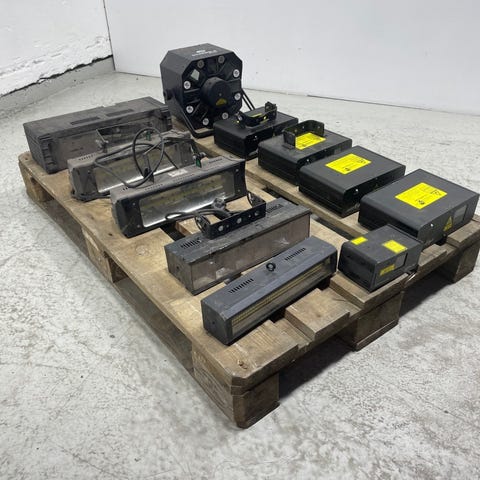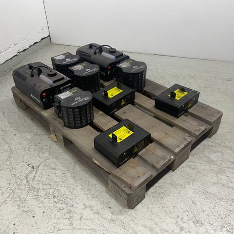 Scenelys og effekter fra ADJ og Laserworld. Utstyret inkluderer røykmaskiner, lyseffekter og RGB-laser. Flere enheter er merket med modeller som ADJ Mini Dekker, Stinger II, VF1300 og Fog Fury Jett samt Laserworld EL-400RGB Mk2.🔹 ADJ Mini Dekker – 25W LED-effekt, AC100–240V
