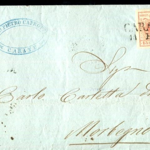 Fullstendig tekstbrev fra Torino 26. juni 62 til Salonicco, frankert med dobbelt porto-tariffa med en stripe av fire p 40 centesimi i rd vermilion, utgave fra 1861. Frimerkingen, p grunn av mangel p plass, ble pfrt over brevet og fremstr som mangelfull. Sammen med et friskt utseende og svrt sjeldent, bde p grunn av destinasjonen og frimerkingen. Sertifikat fra Dr. M. Manzoni. Katalogverdi 9000,00+.