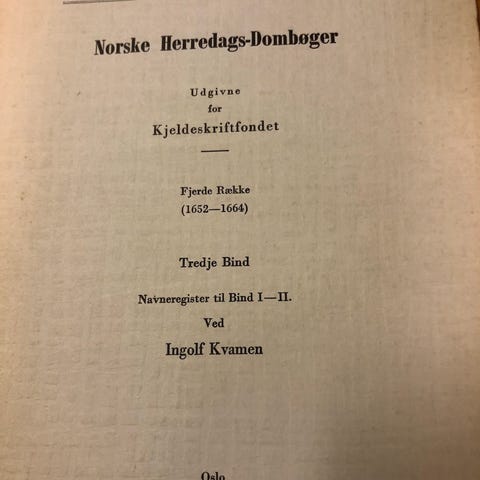Norsk historisk kjeldeskrift-institutt. Norske Herredags-Dombøger. Udgivne for Kjeldeskriftfondet Tredje række(1625-1646) IX. Navneregister for bind I-VII. Ved E W Orholt.Kvamen. Oslo i Hovedkommision hos Jacob Dybwad.