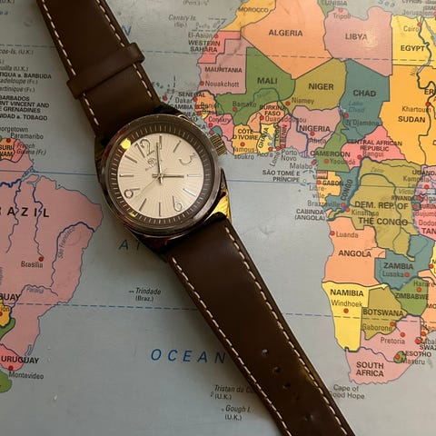 Armbnd/buckel er erstattet med et nytt, ikke-originalt belte og buckel.