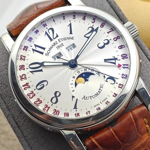 Klokken drives av Schwarz Etienne-fabrikkaliberet J8104, en automatisk sveitsisk mekanisk kronografbevegelse.