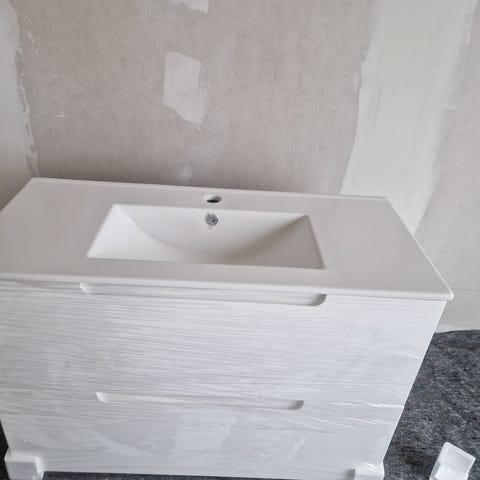 Utstillingen selges som på bildene, uten vask, men mulighet for toppmontert vask.