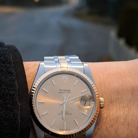 Modell: Tudor Prince Date-Day 76213 gullfarget skive med diamantinnlegg, herreautomatisk sportsur