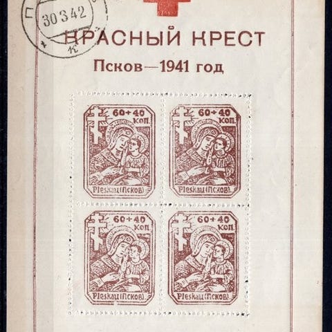 Pleskau, 2 enkeltfrimerker fra Blokk 1 X (verste del av blokken) stemplet, blokkanten ru/knitrende og horisontalt skjev rygg gjennom begge merkene, kontrollert Krischke. Michel (2023) for enkeltfrimerker 700,- .