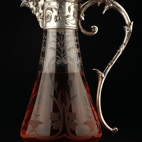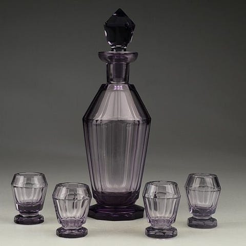 Karafler med glass (6 stk) - Val Saint Lambert. Tykt, slipte glass. Opprinnelse: Belgia, 1920-30-tallet. Svrt god stand, synlige bruksspor.