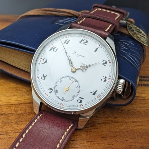 I tillegg br det bemerkes at alle hovedkomponentene i klokken verket, skiven og viserne er originale og kommer fra et autentisk LONGINES-lommeur. P grunn av ombyggingen slik at klokken kan bres p hndleddet, er bare kassedelene nye, nye laget og tilpasset for matche de originale lommeur-delene.