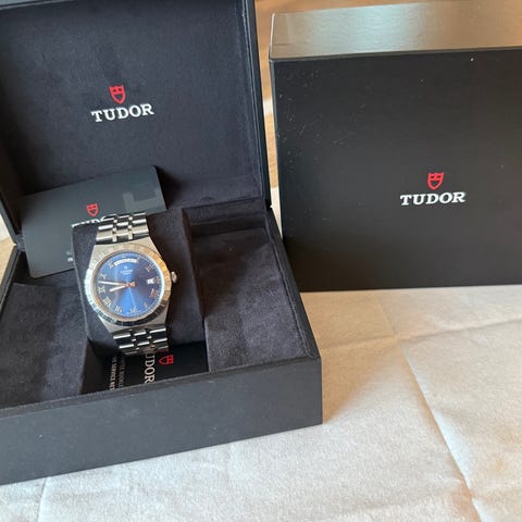 Leveres med eske, med ytre eske, garanti, originalitetsertifikat, garantikort i skinn.