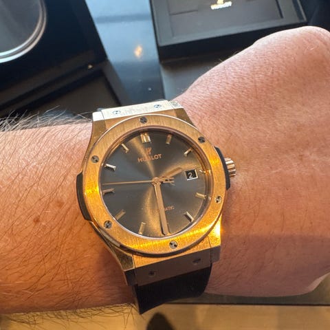 Den originale Hublot-gummireimen er i god stand, fleksibel og fullt brukbar, med moderat estetisk slitasje i samsvar med klokkens alder. Foldelsen av stl, signert Hublot, fungerer som den skal og viser lette bruksmerker.