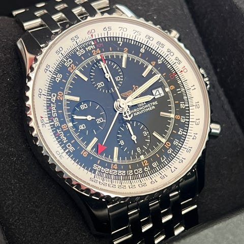 Breitling Navitimer World (Ref: A24322) er en ekte kjempe innen luftfart, og gir en dominerende 46 mm tilstedevrelse p hndleddet. Fremhevet av sin praktiske GMT-funksjon gjr dette tidsmlingsinstrumentet det mulig flge to tidssoner samtidig, noe som gjr det til den perfekte flgesvenn for globale reisende. Klokken har den legendariske toveis glidebezel og et ripebestandig safirglass med dobbeltsidig antirefleksbelegg for best mulig lesbarhet. Dens solide bakside er gravert med tidssonene til verdens viktigste byer, noe som understreker dens kosmopolitiske nd. Tilgjengelig i meget god stand, komplett med eske, kombinerer denne Navitimeren teknisk mestring med tidls eleganse.