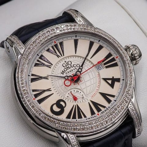 Gio Monaco Geopolis Diamonds (~1,30 ct totalt) er et dristig luksusklokke laget i Sveits som kombinerer italiensk designstil med sveitsisk mekanisk presisjon. Den store 46 mm kassen, diamanter p bezel og lugs, og verdensklokke-komplikasjonen gjr den til et iynefallende unisex-utsagnsarmbnd. Hver del er individuelt nummerert, noe som understreker dens eksklusivitet og samleverdi.