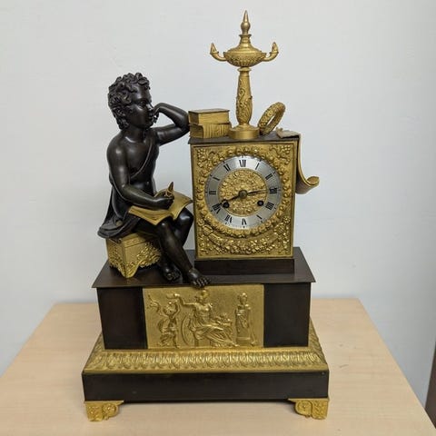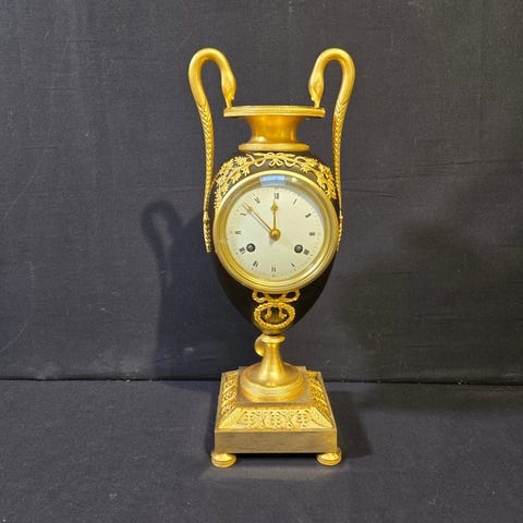 Fransk imperium-klokke, fra det nittende rhundre, i gullbelagt bronse med finhndsarbeid.