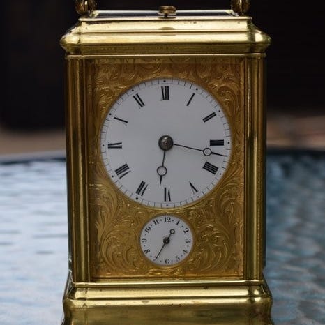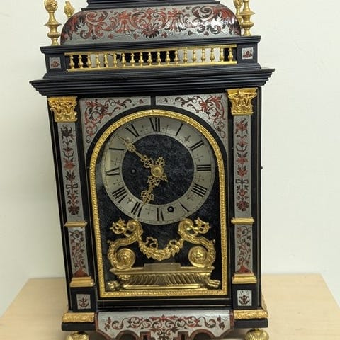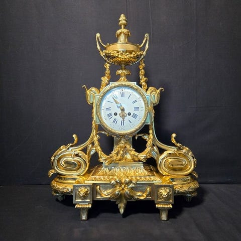 Louis-Philippe i mahogny, restaurert, portikklokke fra det 19. rhundre, laget av verdifullt tre med marqueteri, forgylt bronse, emaljert urskive, mekanisk urverk med nkkel. Jeg vet ikke om den fungerer, det er en nkkel.