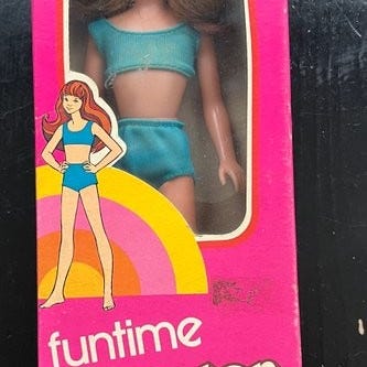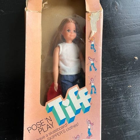 Mattel Barbie Deluxe Quick Curl Skipper 1975 Taiwan. Spor etter oppbevaring, original emballasje med bulket ramme. Bilder er en del av beskrivelsen, studer disse nye.
