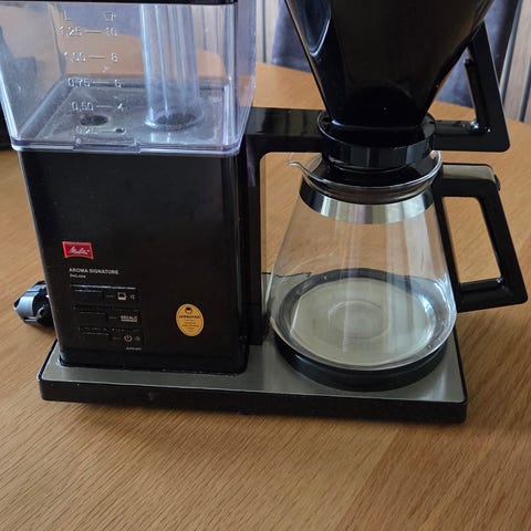 Nyt en deilig og varm kopp med morgenkaffe fra Melitta One filterkaffetrakter 22749. Den har 10-koppers kapasitet, en gjennomsiktig vannbeholder og antidrypp- og auto-av-funksjoner som gjør trakteren veldig praktisk.