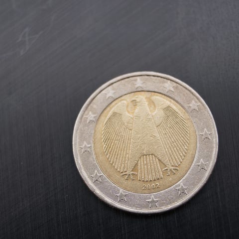 Sett med 2-euro-mynter i kapsel, brukte mynter.