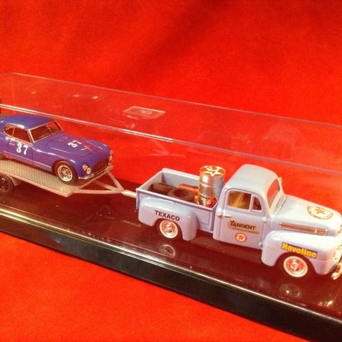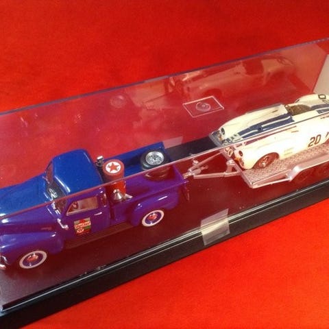 Carrera Pan Am sett 1951 - Greenlight Ford F1 Pick Up Service (med verkty, dekk og i skitne spesielle forhold) + tilhenger + Klaxon Alfa Romeo 6C 2500SS 'Crema Nivea' #19 Carlo e Teresa Panini