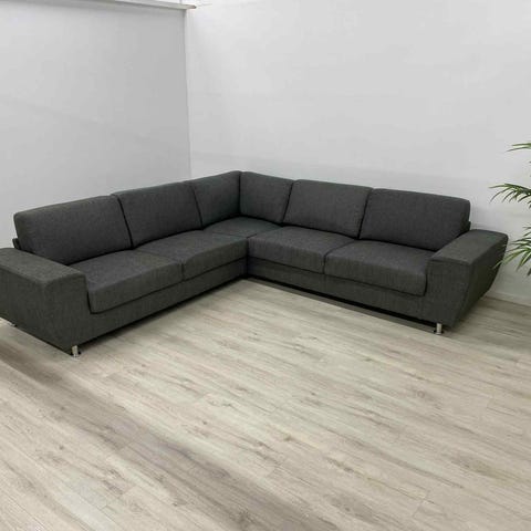Moderne hjørnesofa i dyp mørk grå farge med god sitte- og liggekomfort. Et stilrent valg med romslig sjeselong som passer perfekt til avslapning.
