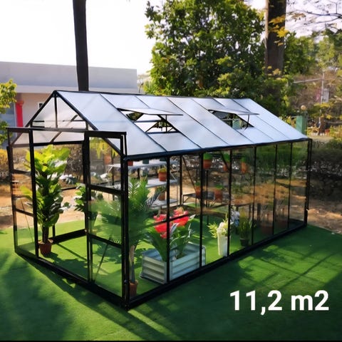 Helt nytt og feifritt drivhus med mål 363x245x20cm Lengde/Bredde/Høyde. Dobbel skyvedør med mål 197cm høyde og 121 cm bredde, 2 store manuelle takluker.Produsert i ferdig pulverlakkerte aluminiumsprofiler i grønn farge, polykarbonat plater i vegger og tak.