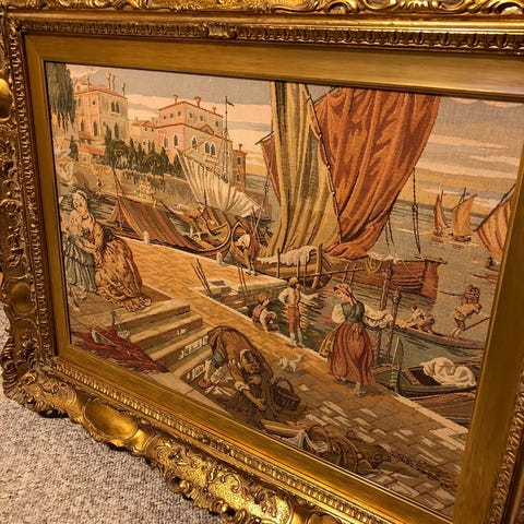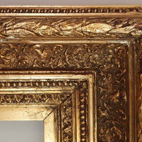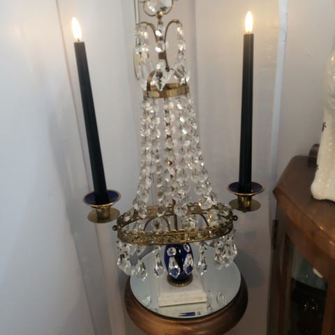 Denne kronen er virkelig litt av et syn med sine store dimensjoner og sin enorme mengde krystallprismer, som sitter tett i tett og lag på lag. Overdådig er vel rette ordet og det kjennetegner jo barokken generelt. Den har 14 lyspunkter som alle virker som de skal. Det mangler helt sikkert noen prismer, men dette er en standard prismetyper som det ikke bør være veldig vanskelig å få tak i. Målene er 75 cm i diameter og høyden er 110 cm.