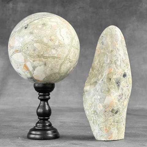 Bordet, laget av kalsittonyx, er spesielt tungt og stabilt (ca. 10 kg), med en tykk ramme som fremhever steinens natur og gir settet et sterkt dekorativt preg.