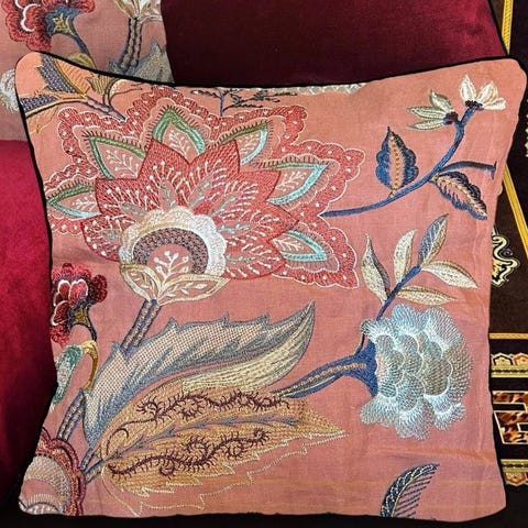 To fantastiske puter laget med Morris & Co's verdifulle broderte stoff 'Lily Cotton' (100% bomull) av Sanderson Group, med bakside i et verdifullt grnt flyelsstoff, en ekstra kvalitet fra Premium Collection.