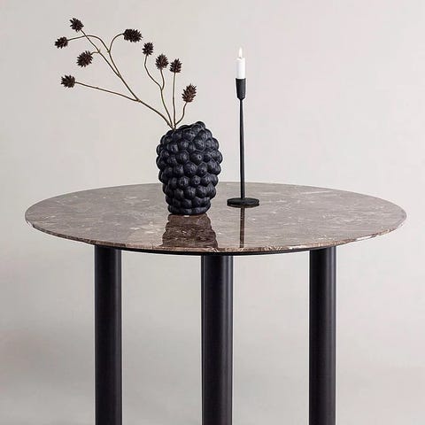 Produktbeskrivelse Earth spisebord er et stilig og moderne møbel som viser frem en rund bordplate i brun Emperador-marmor, som bærer preg av naturlig eleganse og en varm farge. Den robuste, matte sorte kryssbasen i pulverlakkert stål gir både stabilitet og en kontrast til den marmorbelagte overflaten, noe som skaper en imponerende visuell effekt i ethvert rom. Spesifikasjoner Dimensjoner: Diameter 120 cm, høyde 75 cm Materiale bordplate: Brun Emperador-marmor, tung og massiv plate Understell: Pulverlakkert stål Tilstand Bordet er i god tilstand med minimale bruksmerker. Helhetsinntrykket er fortsatt svært godt, noe som gjør det til et utmerket valg for både daglig bruk og spesielle anledninger. Det er enkelt å vedlikeholde og vil forbli et sentralt element i hjemmet i mange år fremover.