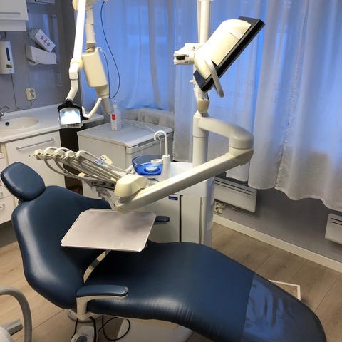En nydelig Planmeca stol i farge sort, frittstående med innstillinger på selve foten..