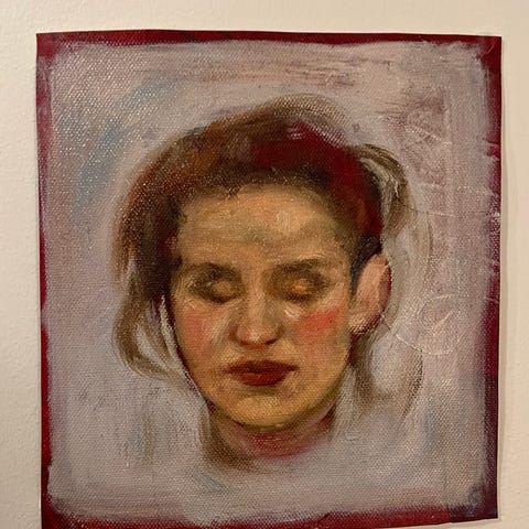 Hennes yne, uttrykksfulle og intense, er rettet mot betrakteren, og gir en flelse av intimitet og dybde. Hun har p seg en hodeplagg.