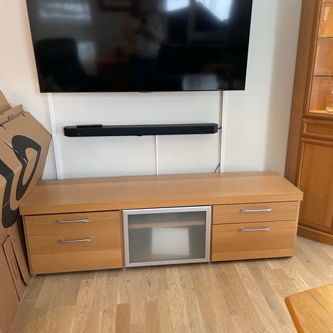 Selger TV-benk og hylle fra Bolia som et samlet sett. I god stand, og oppgradert med høykvalitetsfolie på toppen av tv benken, samt at møblene er vasket og flekket. Pakket pent inn og selges med hjemlevering inkludert i prisen.